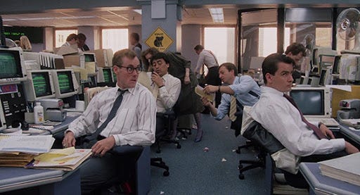 Sixteen years later, in 1987, we get a very different vision of New York in Wall Street. The physical spaces alone tell the story: the brokerage floors in Manhattan - glass, chrome, screens - are set against the blue-collar airline maintenance hangars in Queens, where Bud Fox’s father works amid tools, rust, and sweat. The geography maps two moral philosophies. Lou Mannheim’s older capitalism imagines finance as support for productive industry: money enabling work. Gordon Gekko’s doctrine is the opposite. “I create nothing; I own,” he says, the line a statement of the new economic reality, in which value is conjured through information. Not labour.