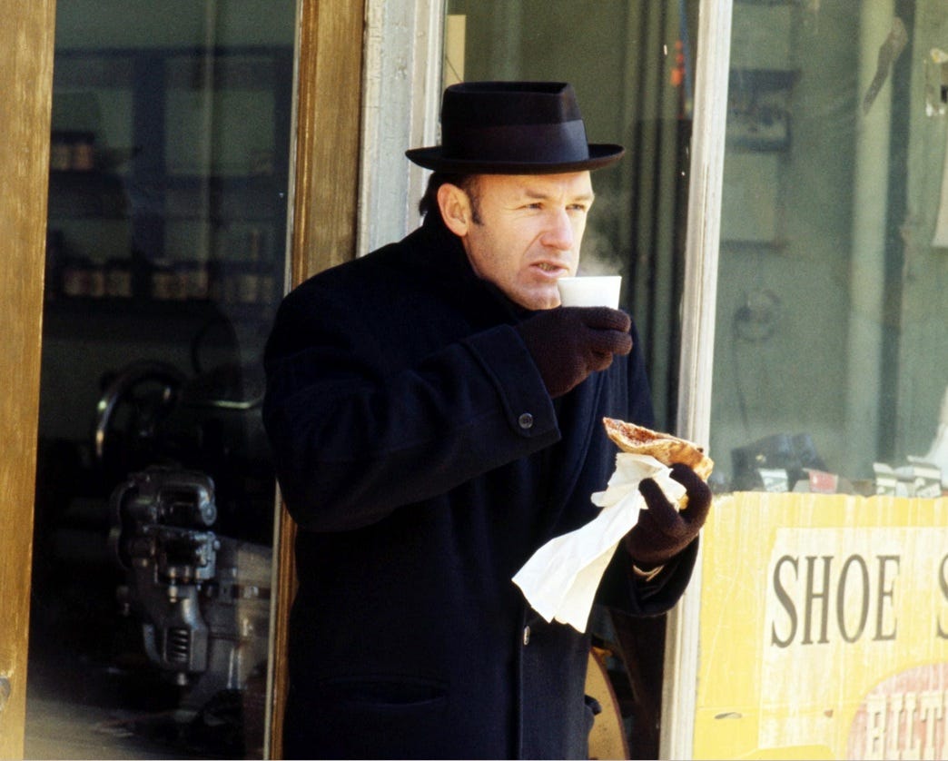 In The French Connection, director William Friedkin masterfully captures the gritty textures of the urban landscape: heroin deals and police surveillance alike are done in person, in real time; the knitted woollen gloves of the policeman Popeye Doyle (Gene Hackman) standing shivering in a doorway, the “grape drink” and toffee apple sold at the subway station, the burned-out empty lot, the early-morning bar where you can pass out without being asked to leave. New York in The French Connection is still a grimy industrial city. We can see this in the dockside scene where the car bearing the heroin is transferred by crane sling, with its litter-strewn piers, forklifts and longshoremen.